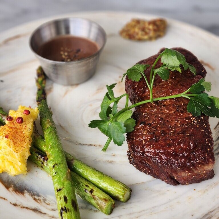 Signature Steak: Cooked to your preferred doneness, the steak is tender and juicy, served with seasonal vegetables and a choice of sauce.