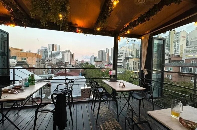 A short walk from the Book Street, "Deeper Rooftop" offers one of the best hidden rooftop experiences in Hongdae. Overlooking the Gyeongui Line Forest Trail, it’s the perfect spot to unwind with craft beers and wood-fired pizzas.