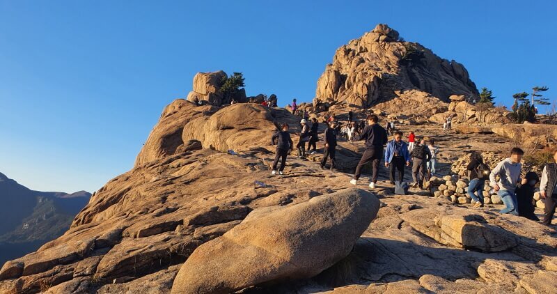Midway through, you’ll reach the famous Heundeulbawi, a giant boulder that can be rocked (barely) by visitors. It’s a popular rest stop before tackling the tougher final kilometer to the peak.