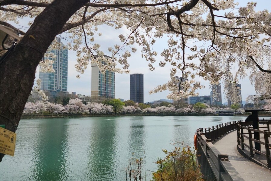 Seokchon Lake Park, divided into East and West sections, is a scenic lake surrounded by cherry trees, walking paths, and seasonal art installations. It’s one of Seoul’s most popular springtime spots during cherry blossom season.
