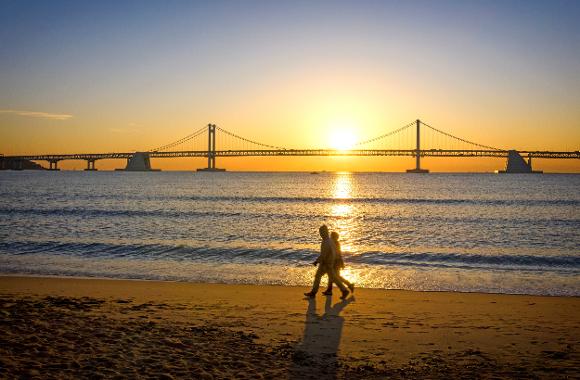 The sunrise at Gwangalli is framed by the majestic Gwangan Bridge, turning the whole scene into a golden masterpiece. As the sun slowly ascends from beneath the structure, there is a breathtaking moment when it seems to rest right on top of the bridge. When the full sphere of the sun appears, Gwangalli is drenched in a blaze of golden light, an experience that fills your heart with profound emotion.