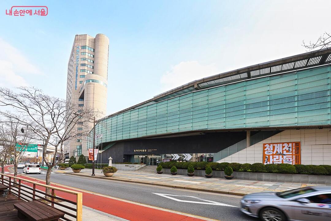 Across the street, the Cheonggyecheon Museum is a substantial facility. The long, stretching architecture and clear glass finish are said to symbolize the flowing waters of Cheonggyecheon.