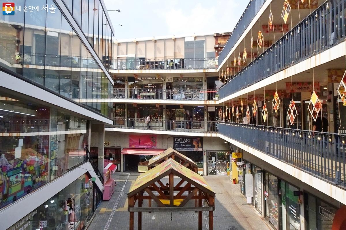 When you enter Ssamzigil, the first thing you see is the central courtyard open to the sky, often hosting exhibitions and performances. But the real charm lies in its architecture.