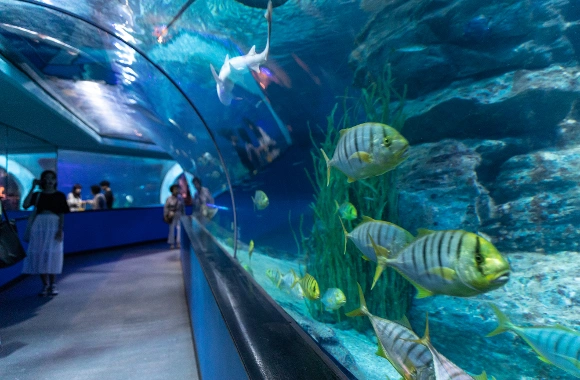 The most popular section of the aquarium is undoubtedly the Seabed Tunnel. As you walk through this 180-degree transparent tunnel, you feel as though you are strolling along the ocean floor. Huge sharks glide slowly overhead, followed by schools of nameless fish, creating a scene that draws gasps of wonder from adults and children alike.